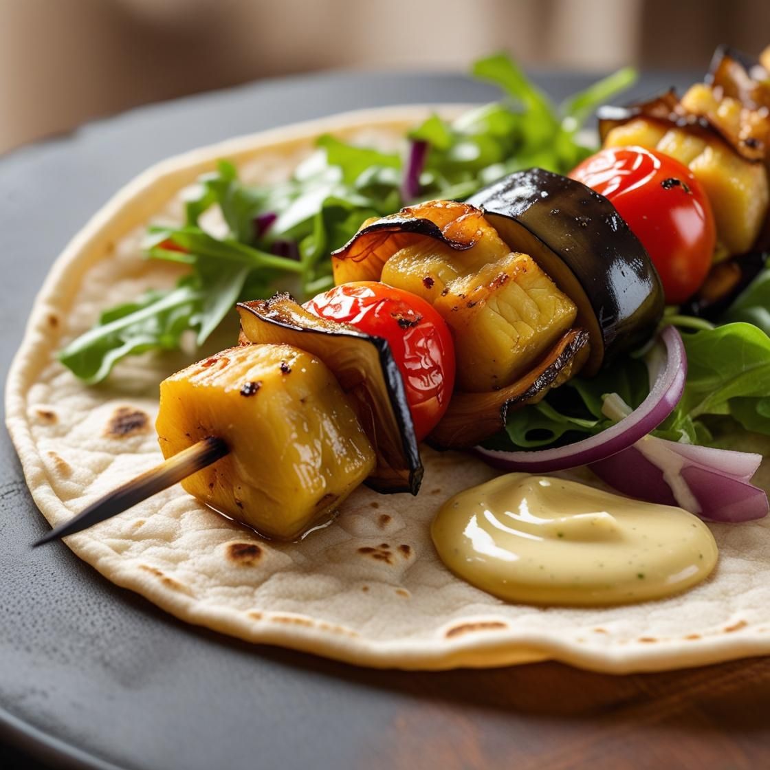 Tender young jackfruit, marinated in a blend of garlic, smoked paprika, and lemon, skewered with juicy tomatoes, caramelized onions, and smoky eggplant. wrapped with hummus to provide a complete supply of vegetable protein.