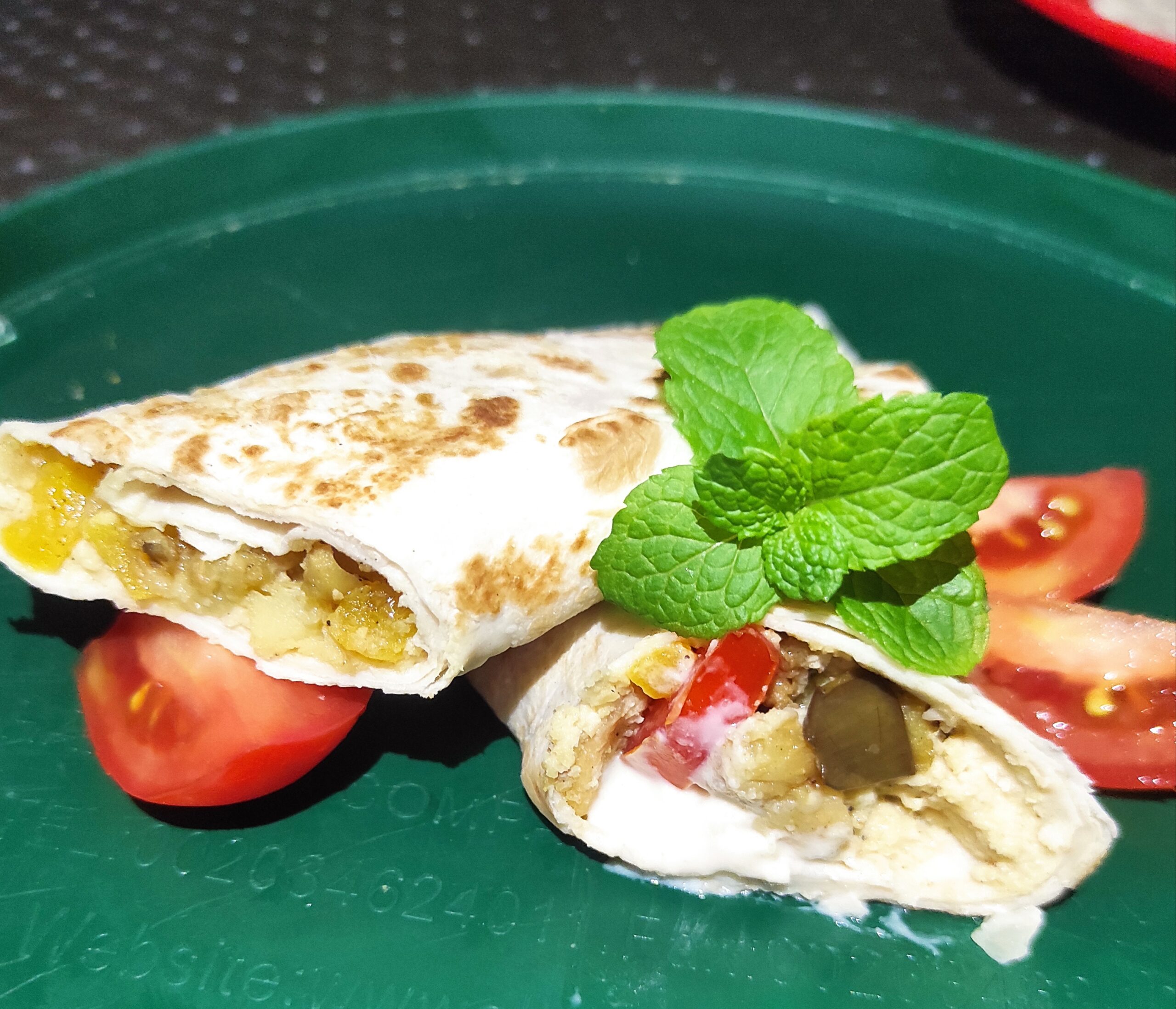Mediterranean Eggplant Salad with hummus in tortilla bread