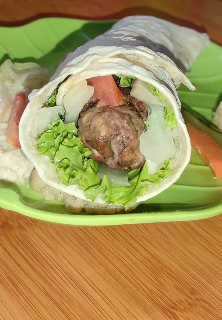 Grilled kofta wrapped in chapati bread with sauce and fresh vegetables.
