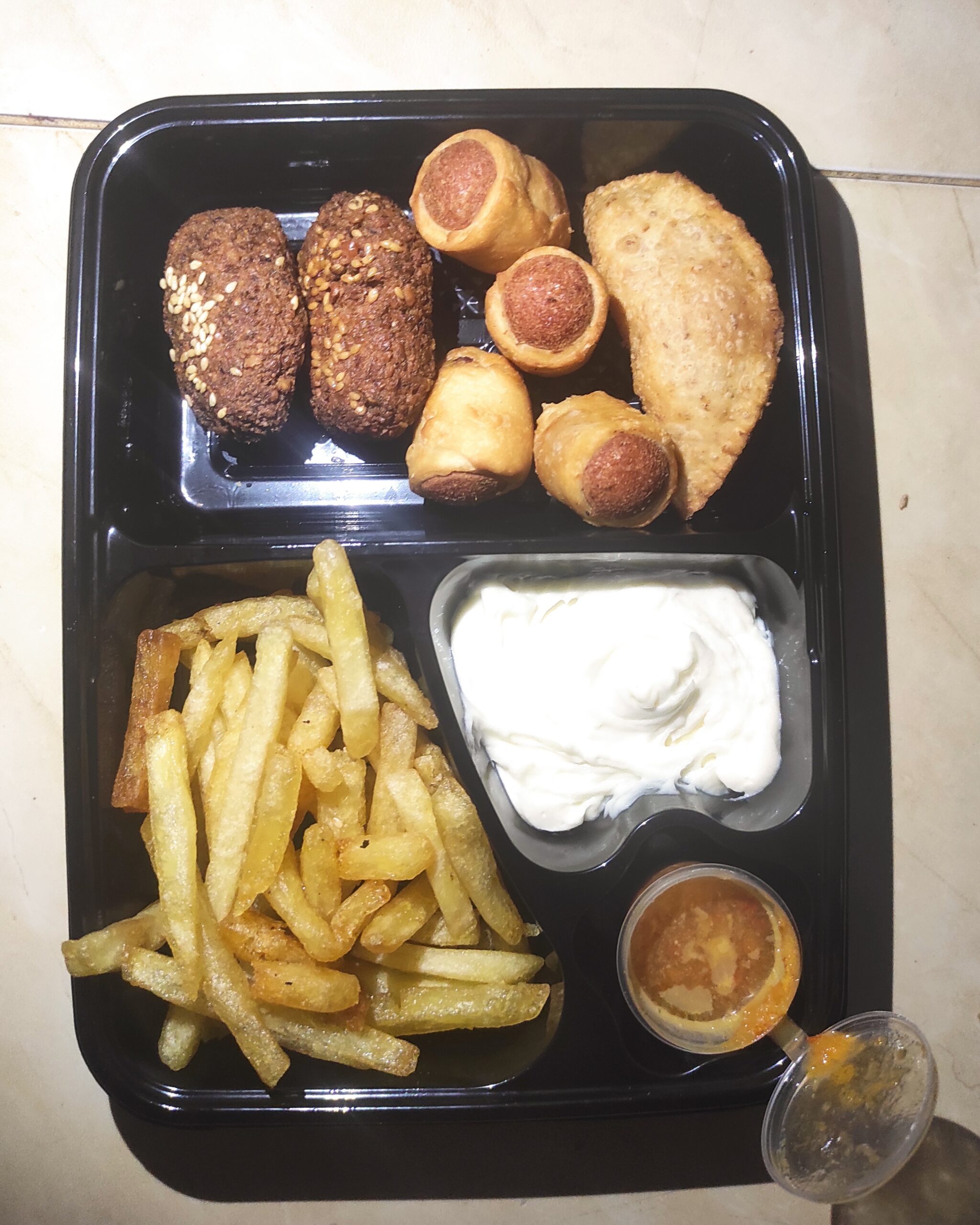 4 types of crunchy yet fluffy snacks with hot sauce and one dip from your choice.